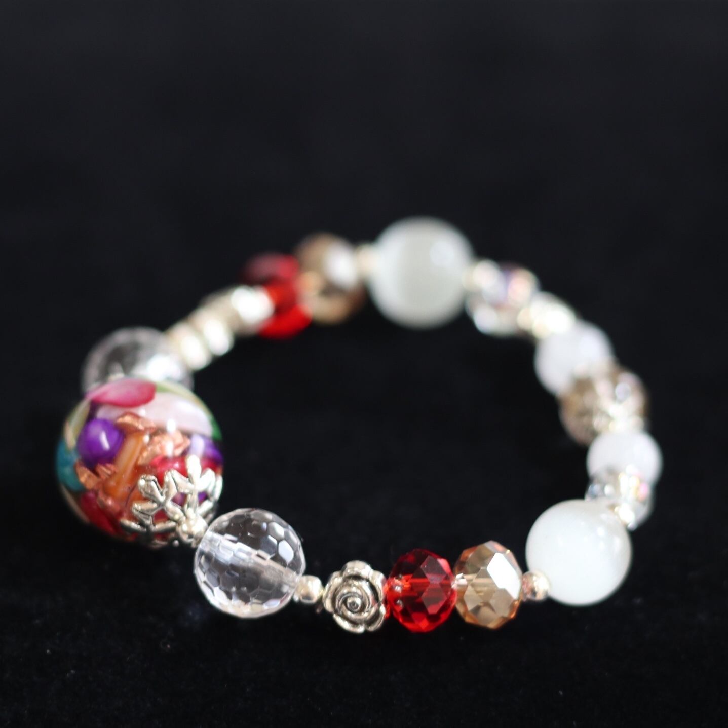 オルゴナイト部分はシェル(多色)で仕上げてあります。薔薇やハートを付けて可愛く仕上げました。