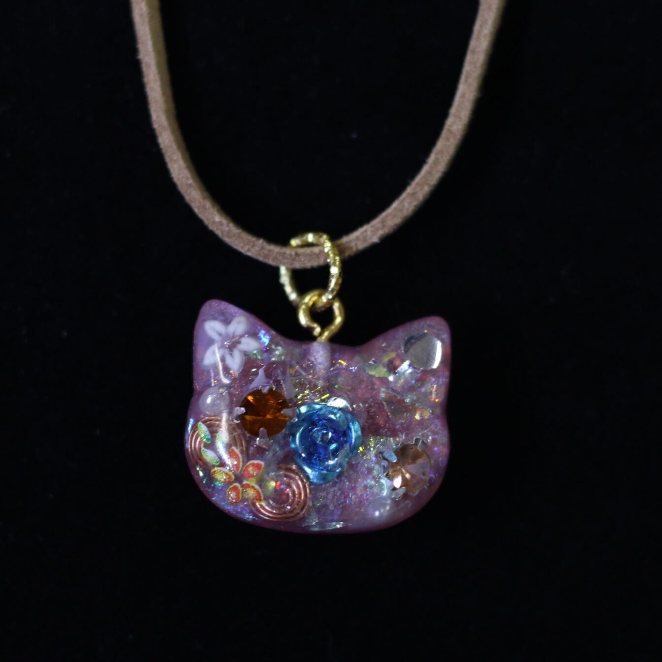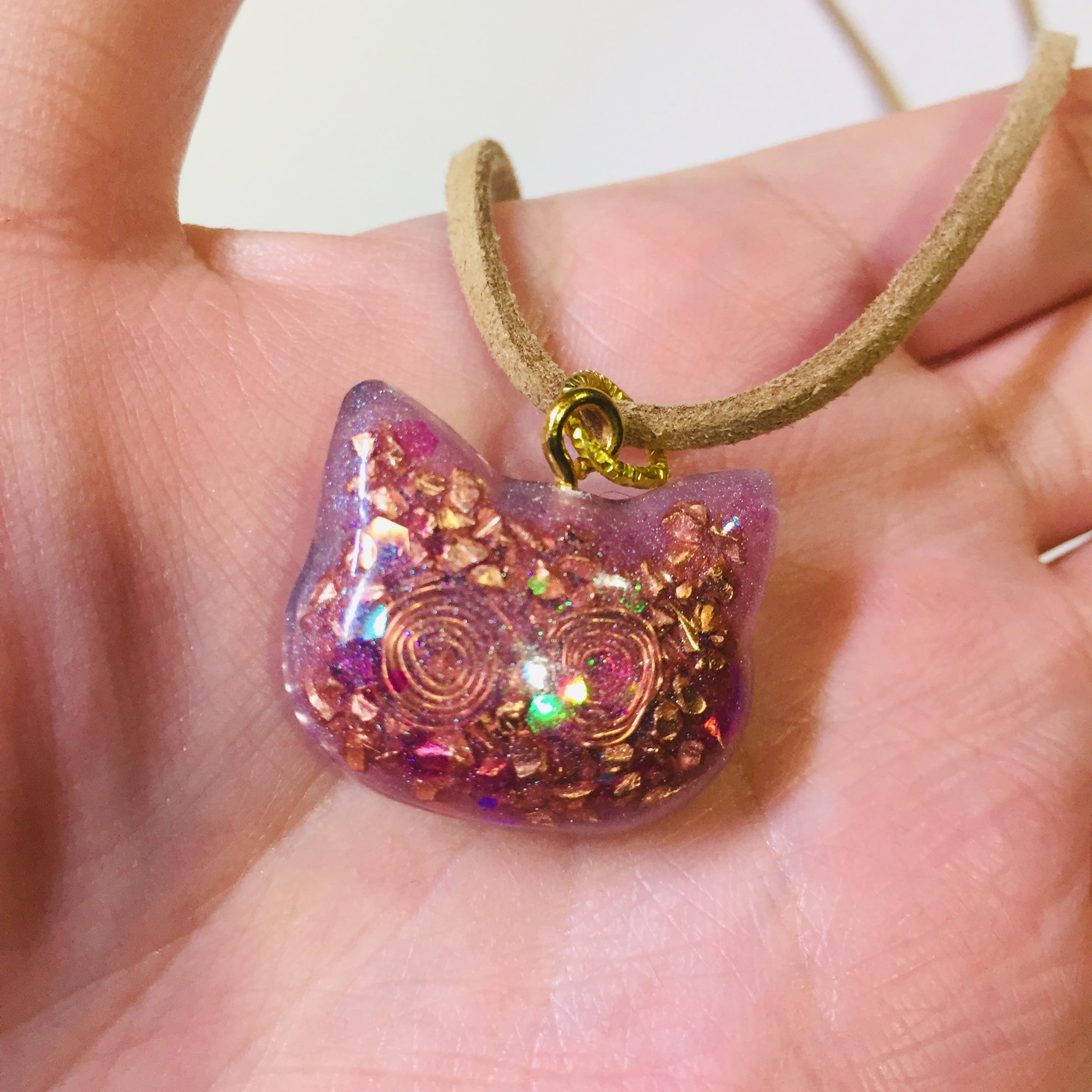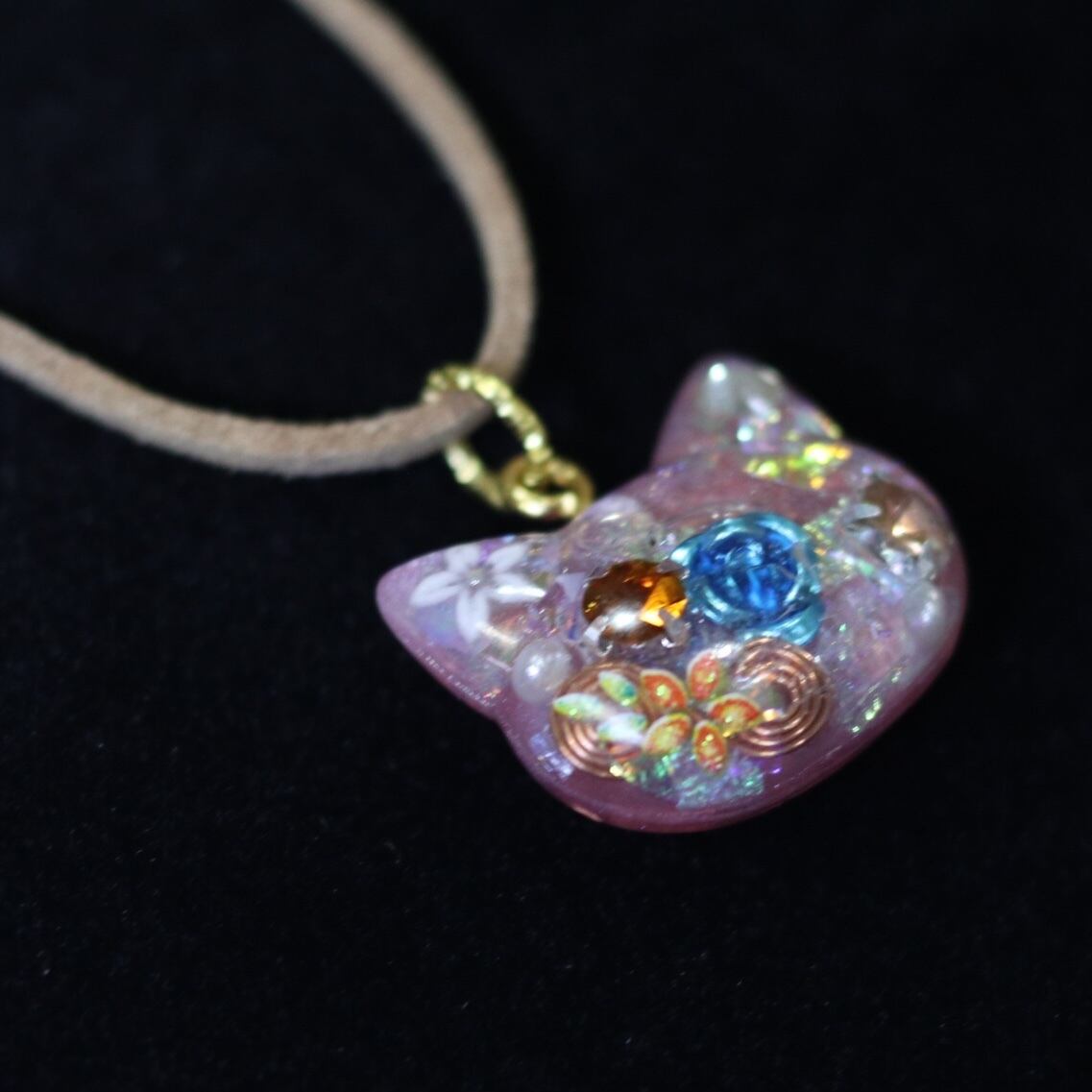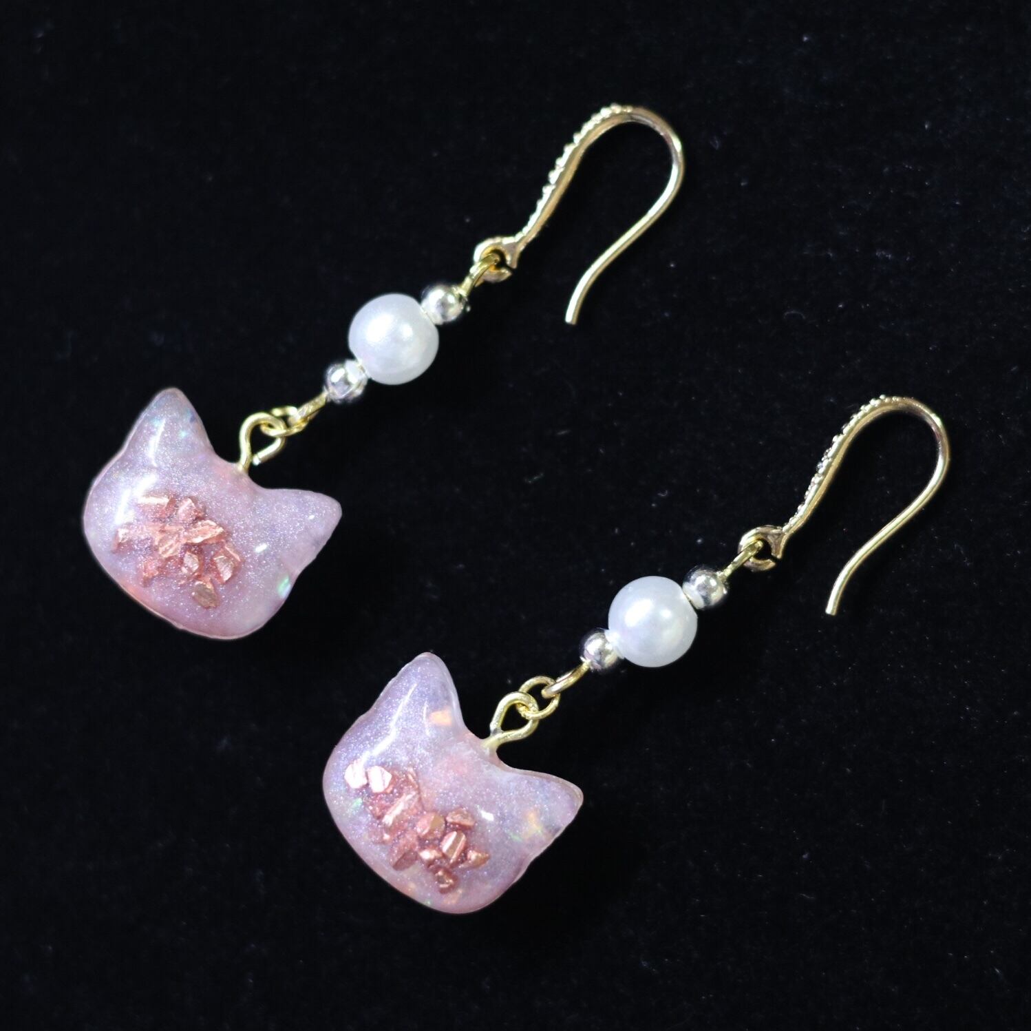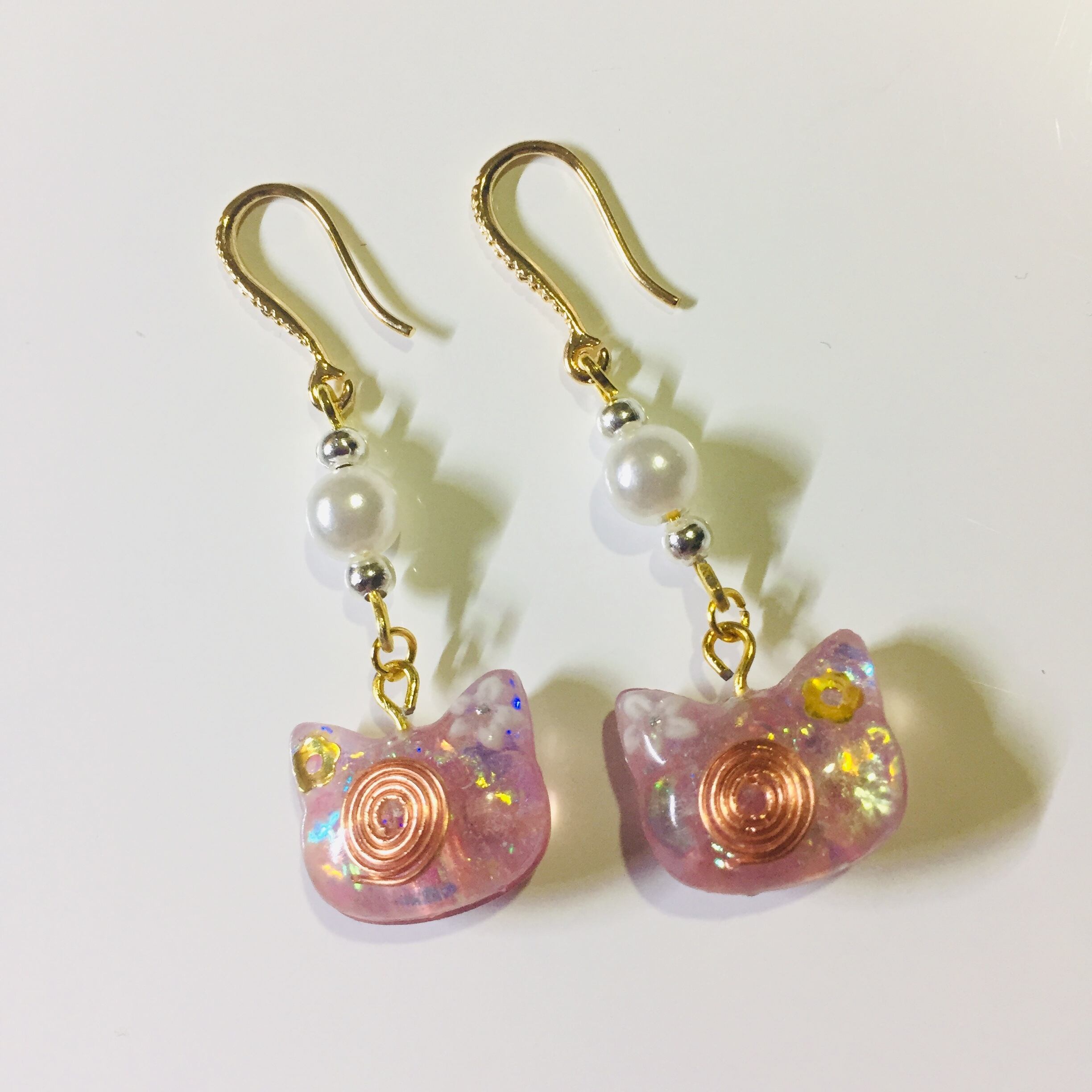 猫のペンダント・ピアス♡セット♡オルゴナイト♡パールピンク♡
