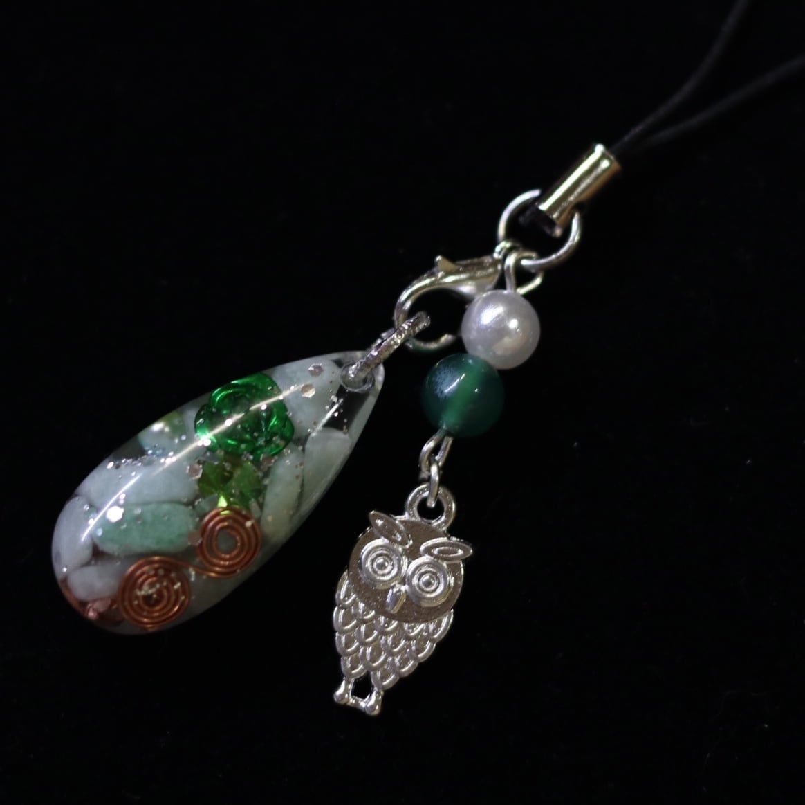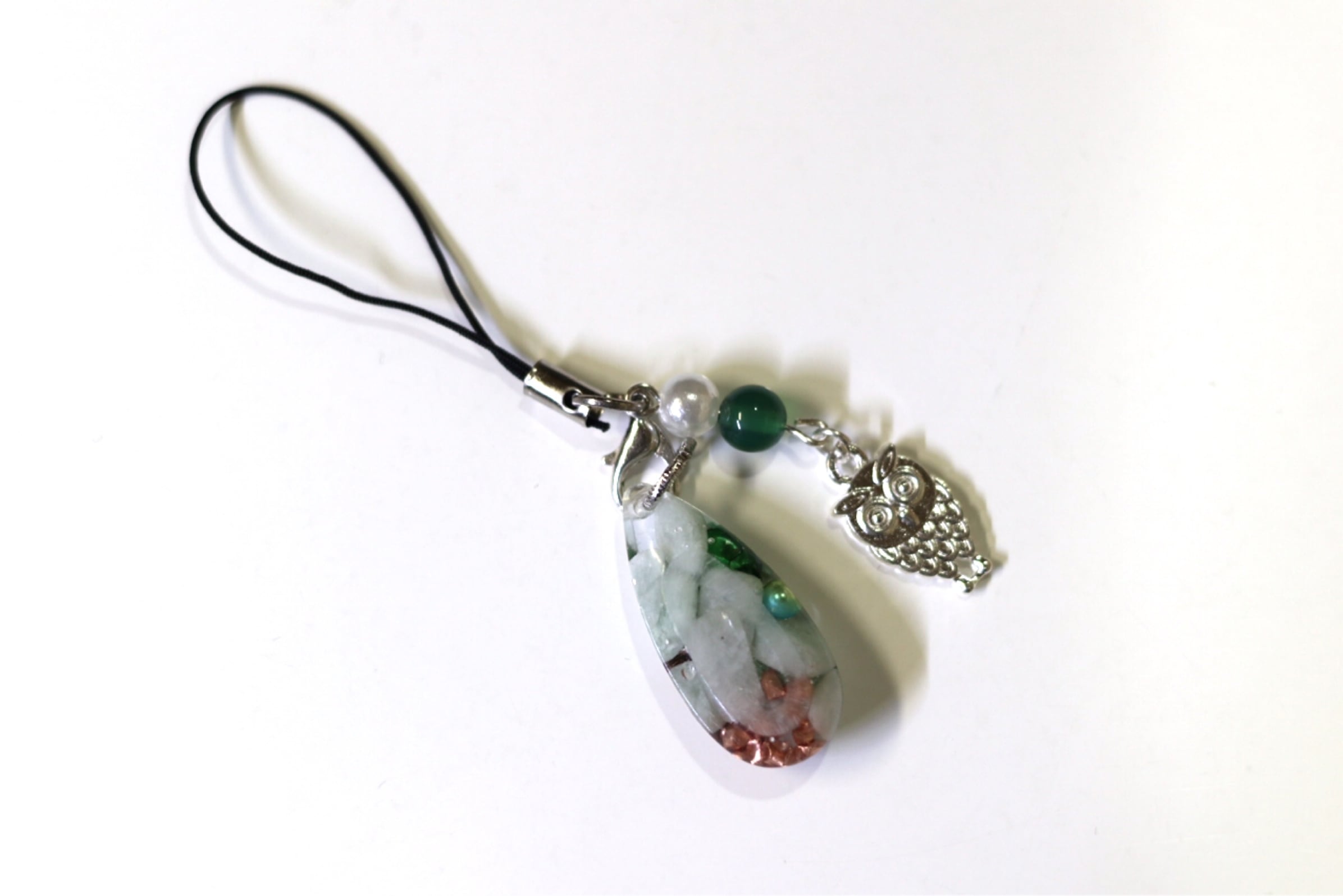 5月誕生石✴︎翡翠オルゴナイト☆*ストラップ☆*幸運✴︎繁栄✴︎ふくろう♡
