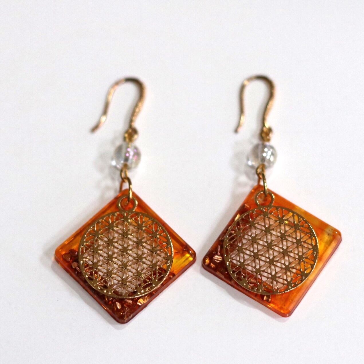 フラワーオブライフ×オルゴナイト*ゆらゆらピアス♡黄×ゴールド☆