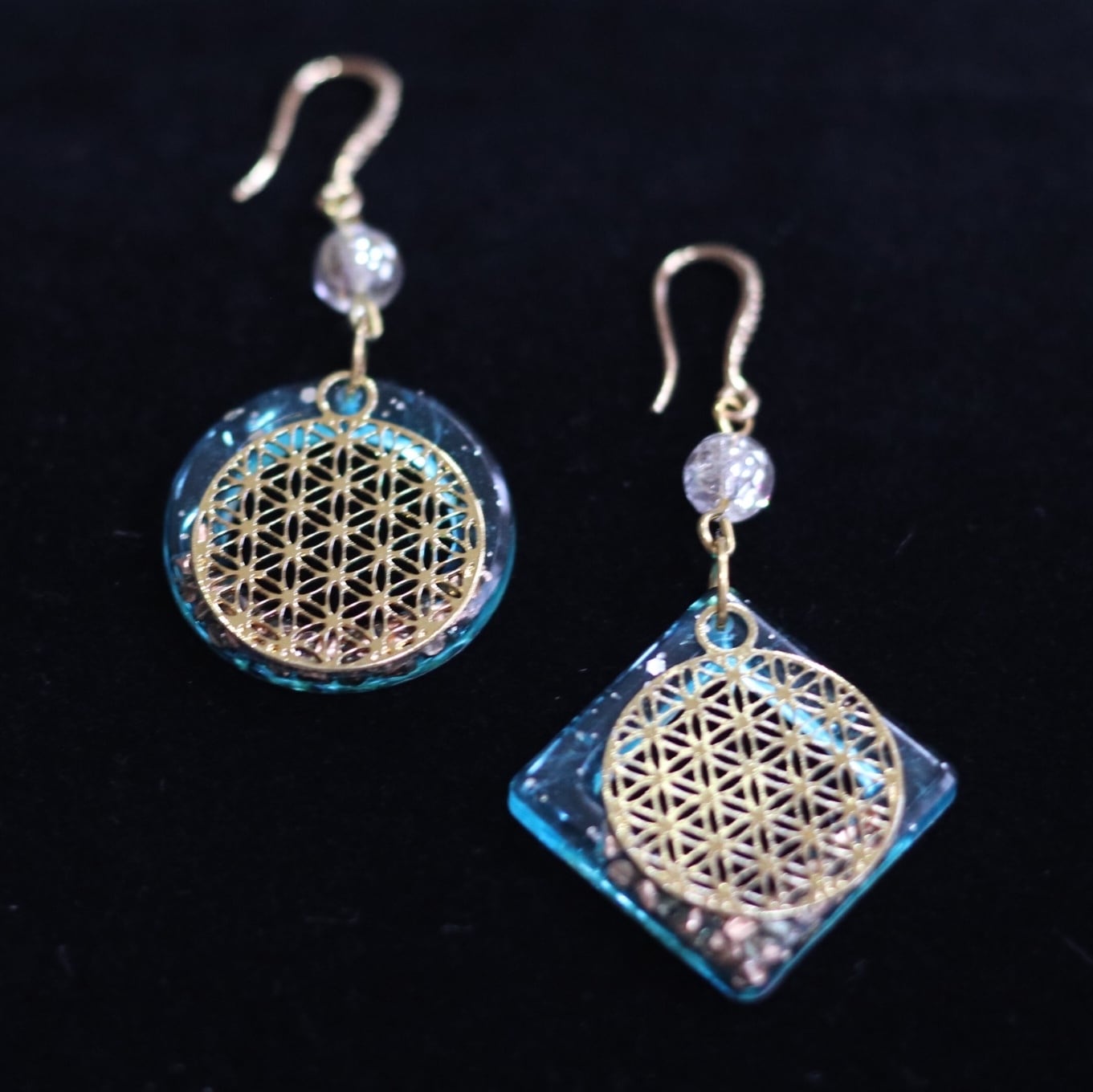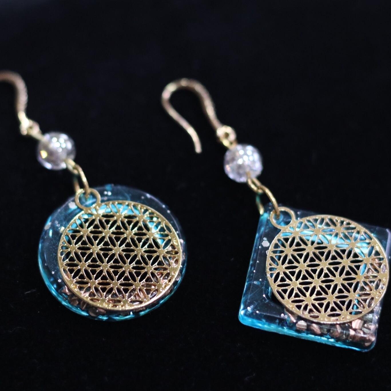 フラワーオブライフ×オルゴナイト*ゆらゆらピアス♡青×ゴールド☆